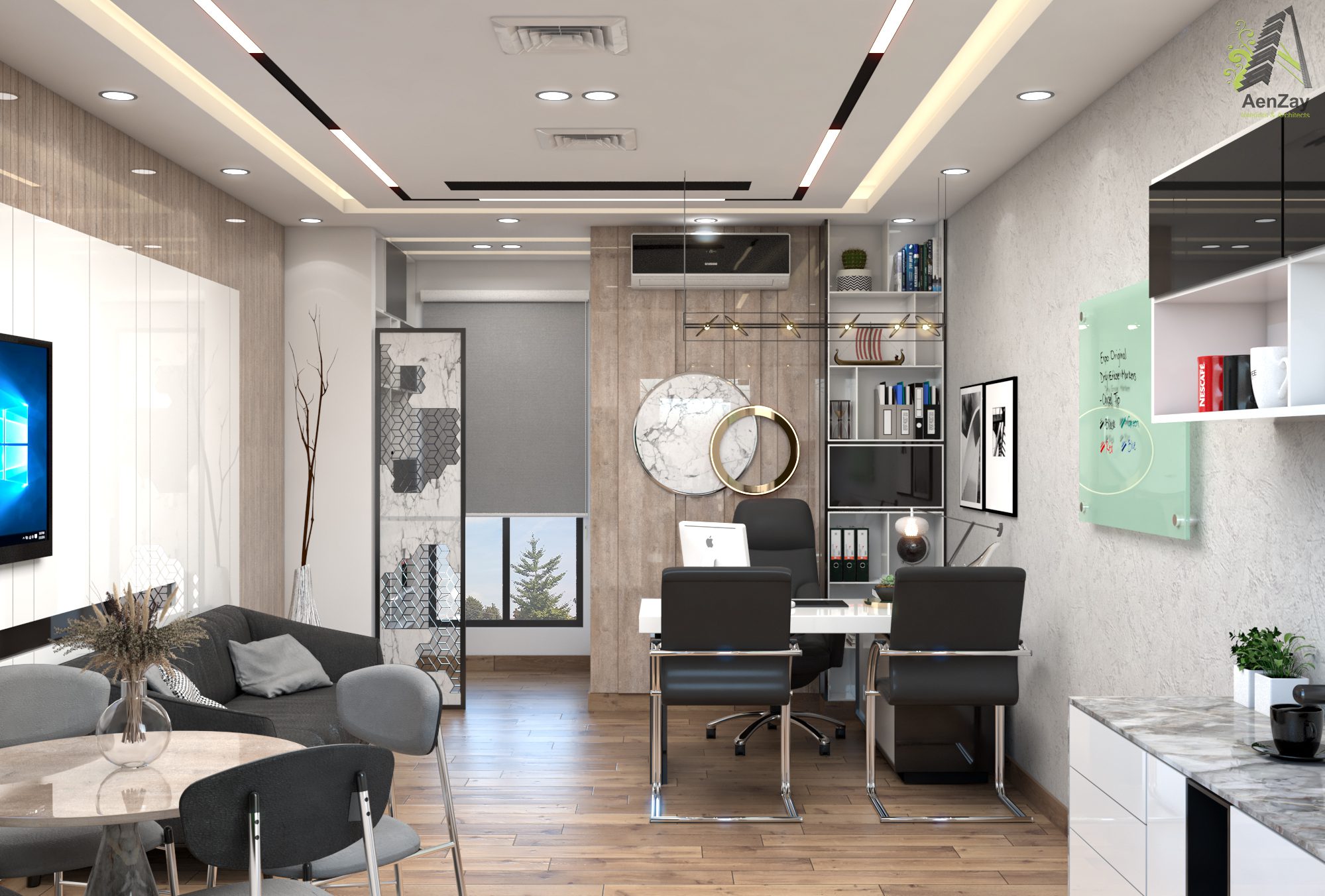 e) a giant rectangular desk in the center, bookshelves around the perimeter of the room, a fenced-off seating vicinity – a basic answer for serious entrepreneurs.